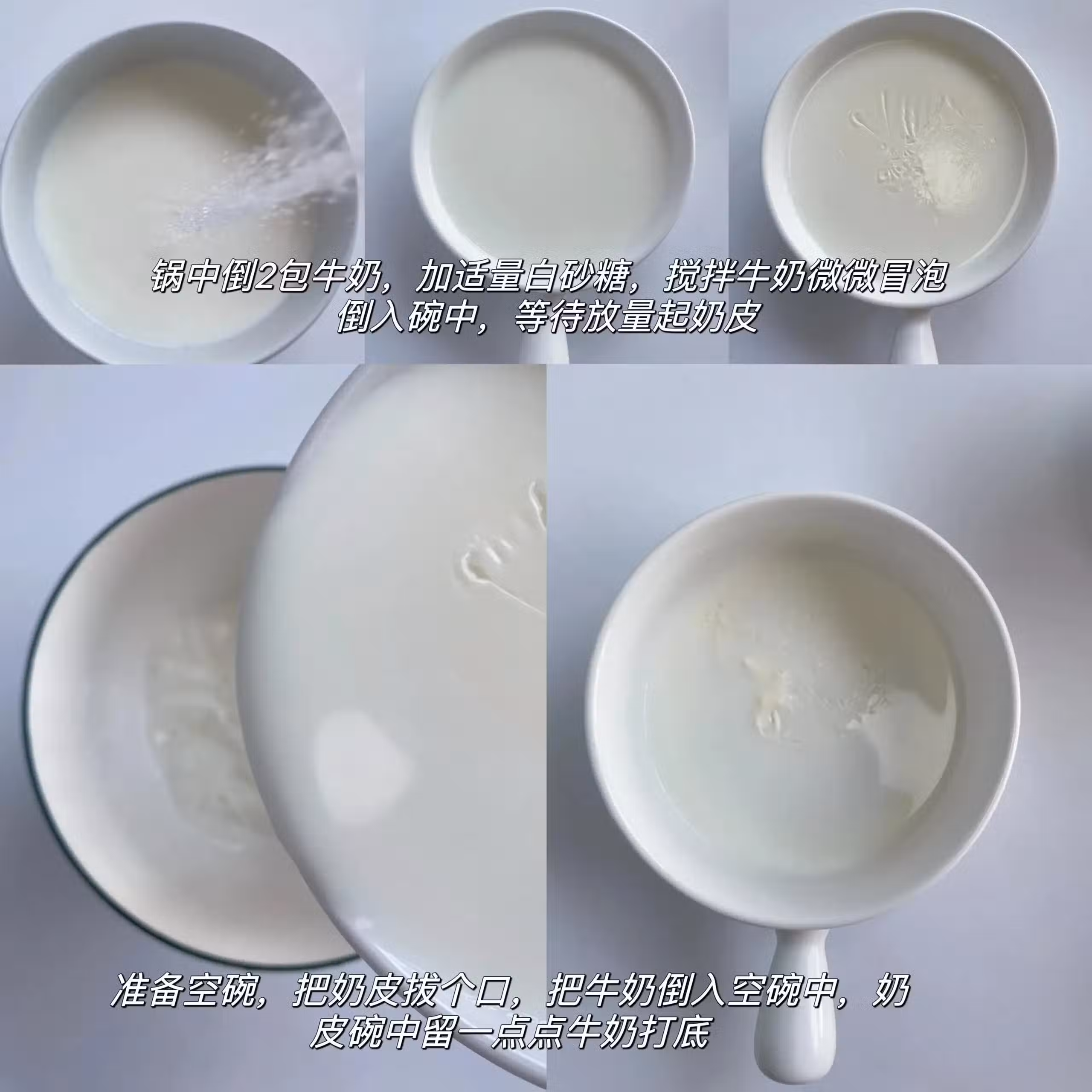 4、然後把過濾過的雞蛋牛奶混合物小心地倒回帶有奶皮的碗中。記得要慢慢倒,以免破壞奶皮。