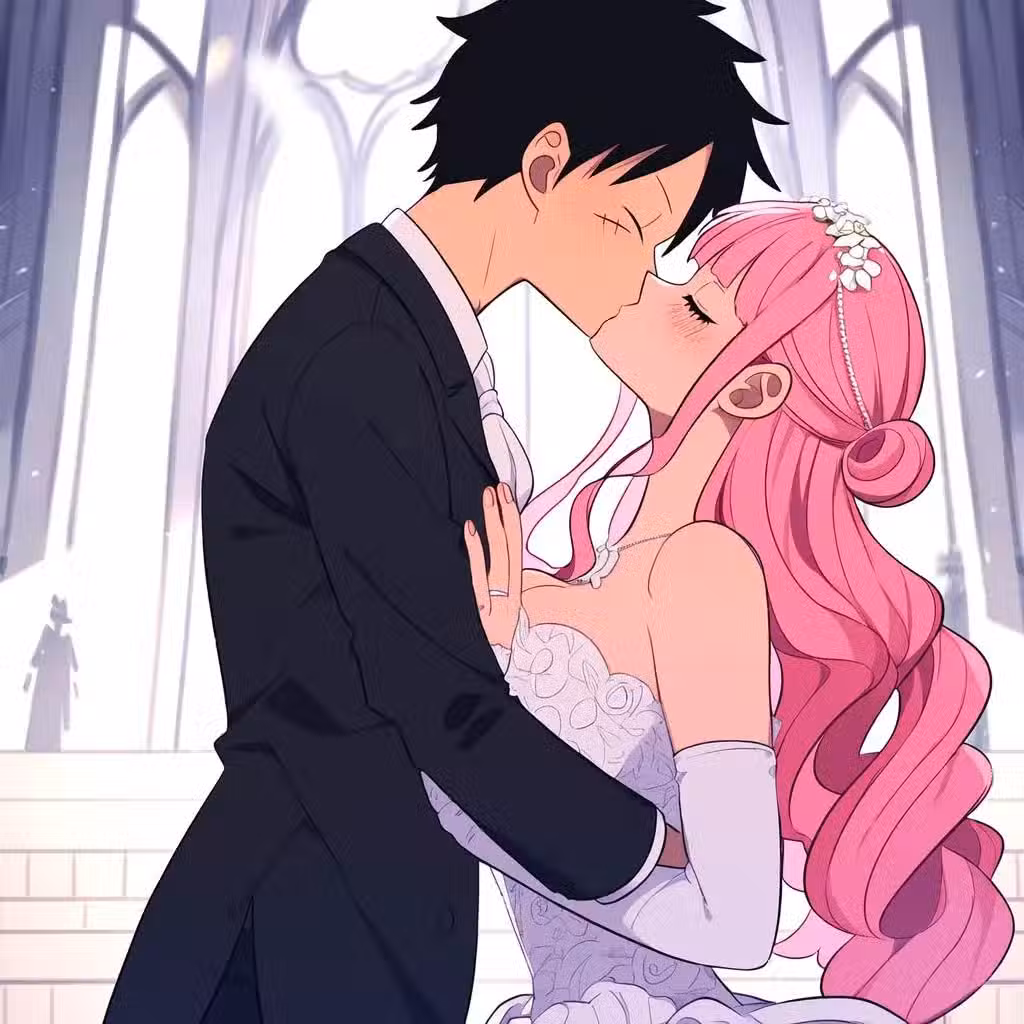 在禮堂的暖光映襯下,路飛和索隆的CP佩羅娜緊緊擁抱著。他們的眼神交融,彼此的心跳如此明顯。在觀眾的歡呼聲中,他們深情地吻著,彷彿時間凝結在這美好的瞬間。