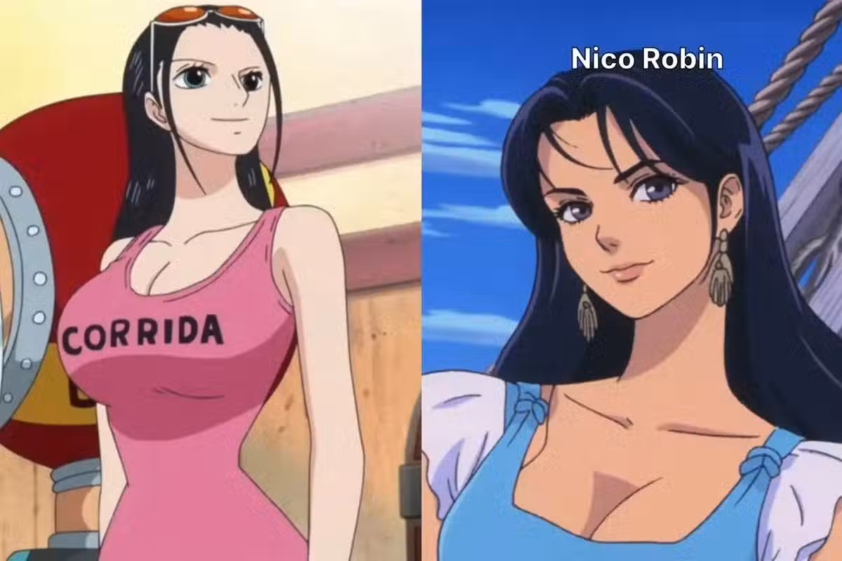 羅賓化身吉卜力公主,皮膚黝黑活潑,像是迪士尼公主,耳環配飾復合海上旅行。她站在海盜船,微風吹拂著長髮,笑容中充滿優雅和神秘,散發著迷人的光芒。