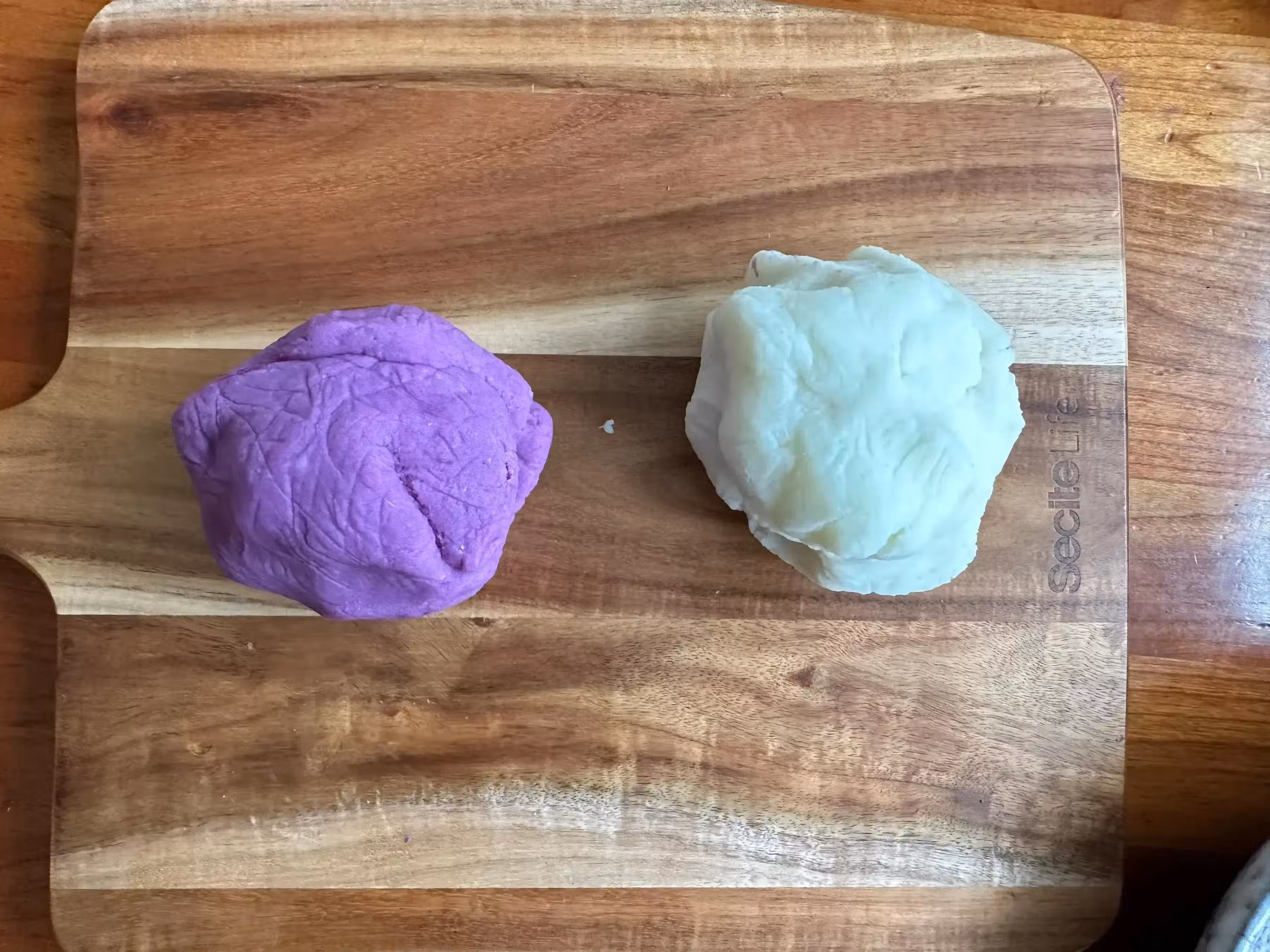 5、再把白色和紫色麵糰分成各20克的小劑子,再把兩個顏色的小劑子和在一起揉圓。
