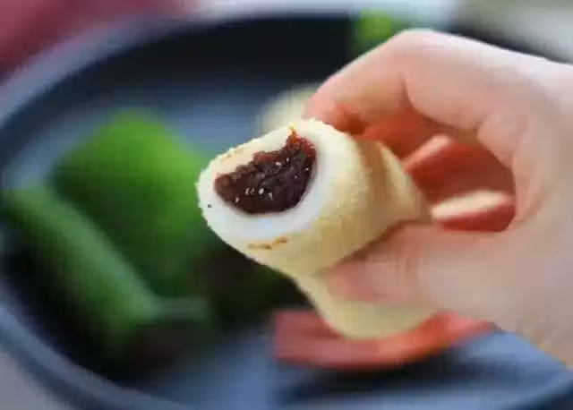 做法:紅棗蒸熟去皮去核壓成棗泥,裝在裱花袋裡;糯米粉➕白糖➕玉米澱粉➕玉米油➕清水混合拌均勻,隔水上鍋蒸25分鐘,趁熱揉勻分成2等份;一份➕4克抹茶粉揉勻,擀成長方形擠上棗泥;包起來切成小段;原味裹上熟黃豆粉;抹茶篩上抹茶粉;