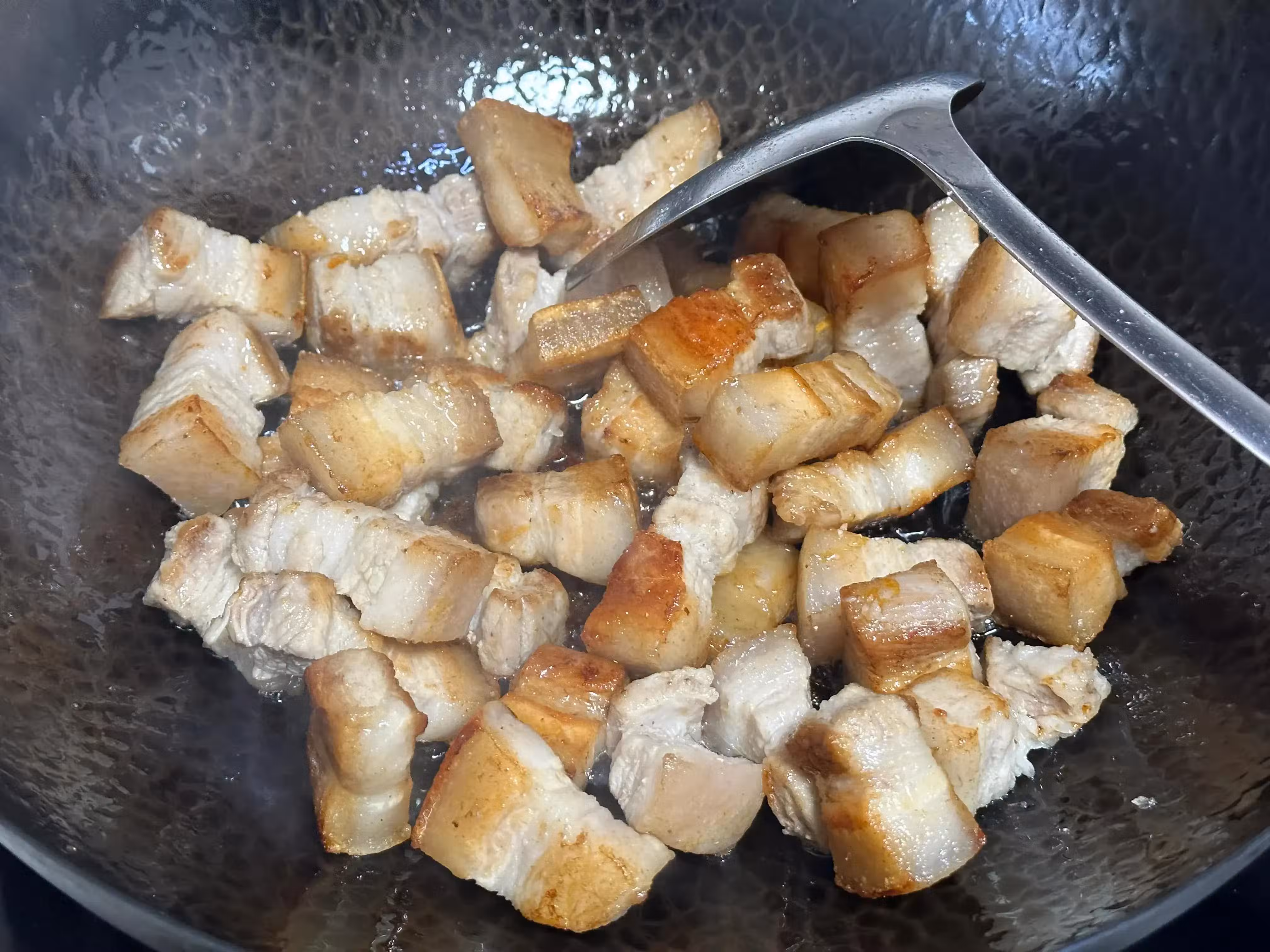 2、鍋中少留一些底油,加入冰糖炒出糖色;表明冒小泡泡就可以。