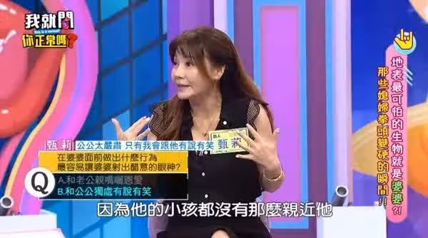 甄莉解釋,自己和娘家人相處,習慣走到哪都要扶著長輩,算是孝順的表現,不過,她還是敏銳地察覺,婆婆不開心、覺得不舒服,而節目現場來賓都覺得不可思議,主持人于美人也問:「媳婦這樣勾著公公正常嗎?」沈玉琳則開玩笑回:「假如我有媳婦的話,我覺得OK!」
