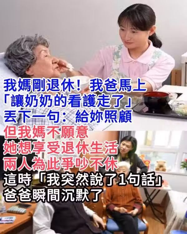 我媽剛退休!我爸馬上「讓奶奶的看護走了」丟下一句:給妳照顧… 但我媽不願意,她想享受退休生活,兩人為此爭吵不休,這時「我突然說了1句話~」爸爸瞬間沉默了