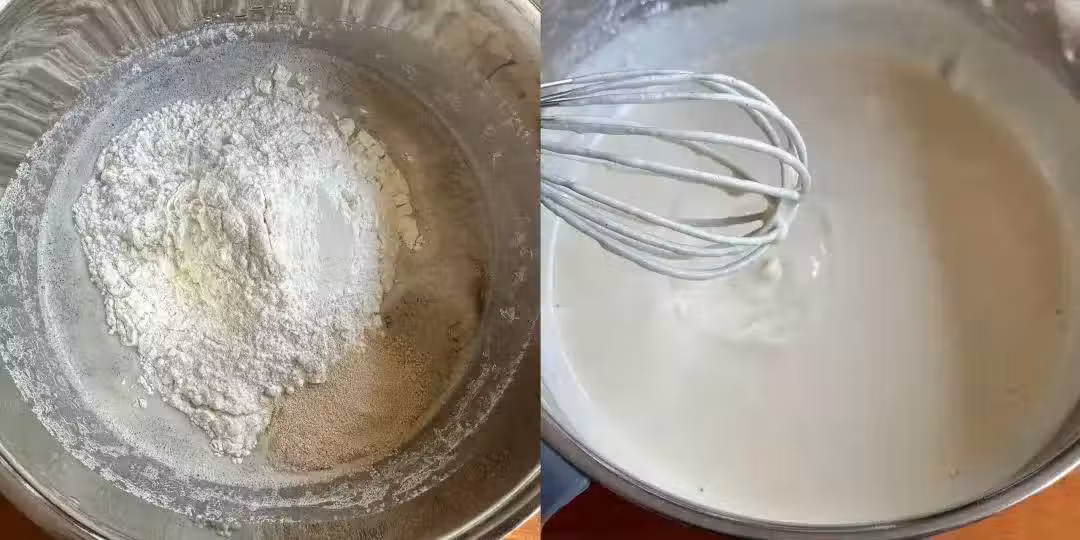 4、室溫密封發酵至2倍大小;發酵好的狀態如下圖;發酵好之後,加入一丟丟的小蘇打和泡打粉,攪拌均勻。。。。