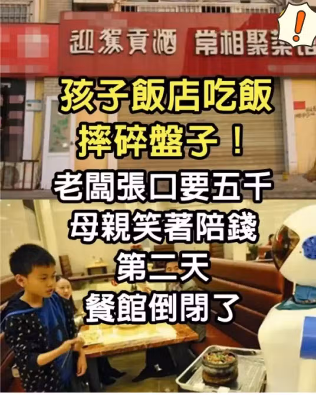 孩子飯店吃飯摔碎盤子,老闆張口要五千,母親笑著陪錢第二天餐館倒閉了