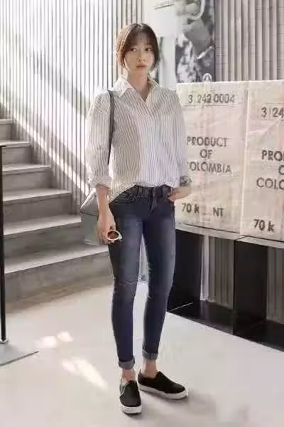 豎條紋設計的白色襯衫,版型寬鬆,單邊的口袋裝飾,不對稱的設計顯得更個性,穿出知性而帥氣的味道,配緊身牛仔褲和懶人休閒鞋,時尚大氣兼顧舒適感。