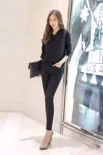 黑色襯衫配黑色緊身褲,很常見的職場裝扮,凸顯知性成熟的魅力,尤其適合身材微胖的女孩,純黑的搭配在視覺上為你減重,看起來輕盈又精神。