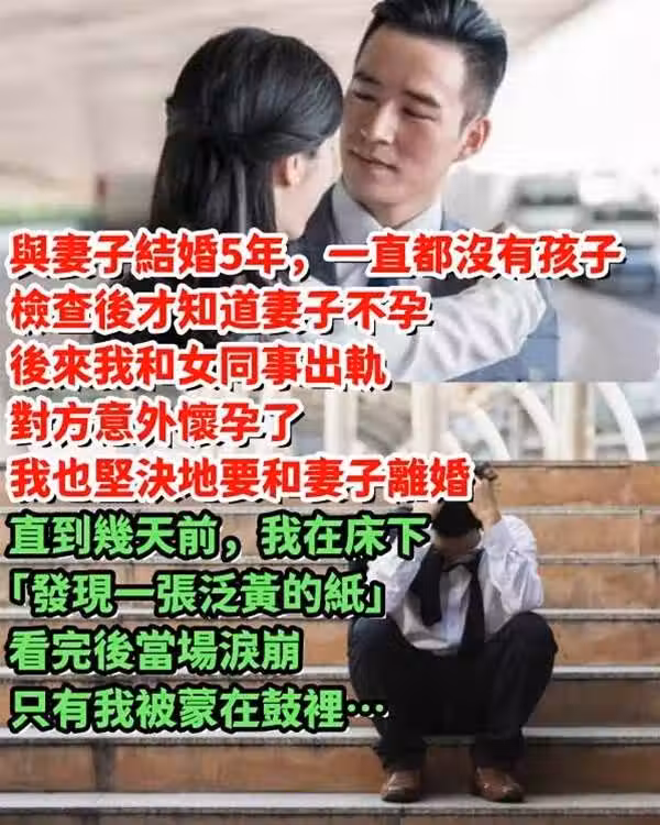 與妻子結婚5年,一直都沒有孩子,檢查後才知道妻子不孕。後來我和女同事出軌,對方意外懷孕了,我也堅決地要和妻子失婚。直到幾天前,我在床下「發現一張泛黃的紙!」,看完後當場淚崩:只有我被蒙在鼓裡…