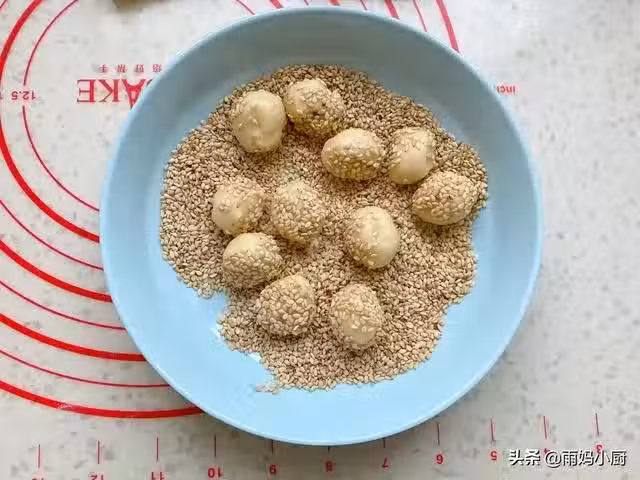 8、用手掌來回把麵糰搓圓,並且是芝麻牢牢粘住麵糰。