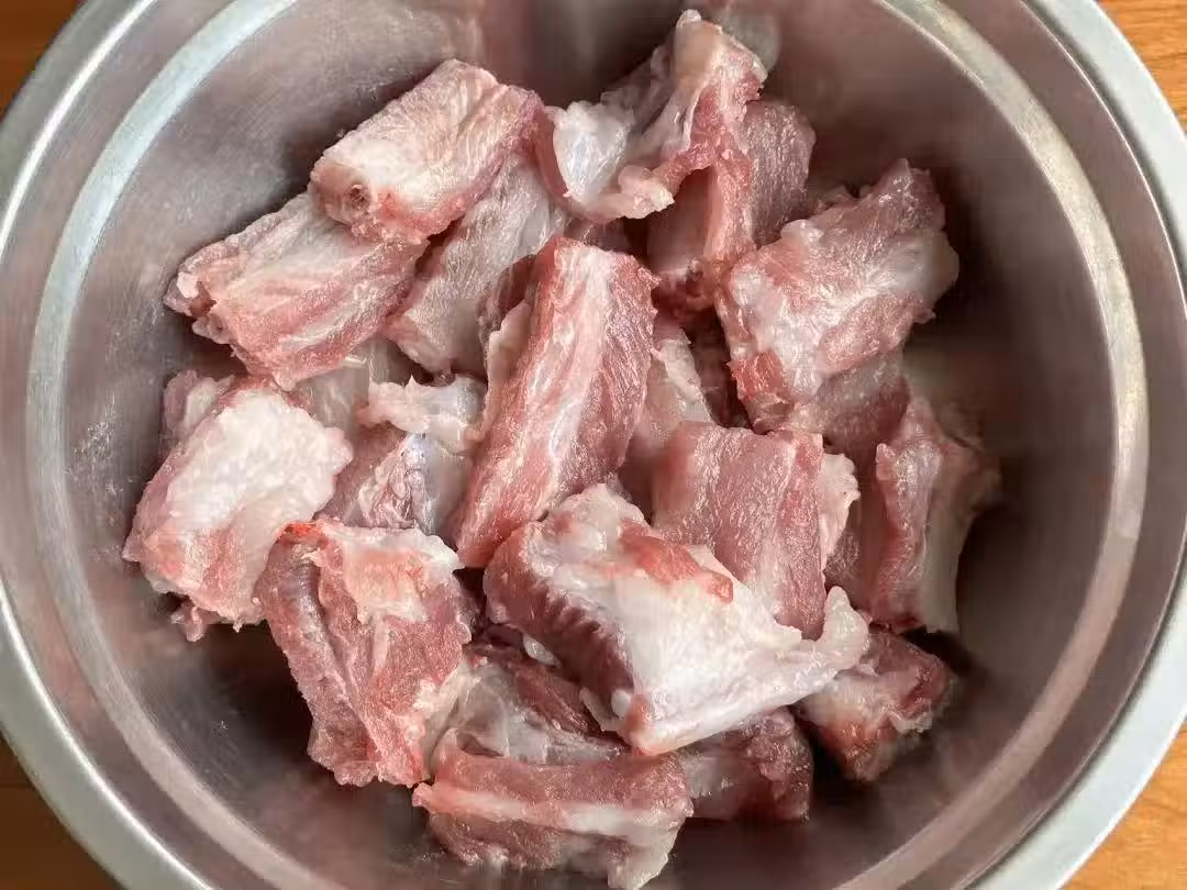 2、給排骨炒個糖色,冷油冷鍋,加入白糖炒至起密集的小泡泡,下排骨翻炒至上色;如果排骨油比較多,加的油量要減少。