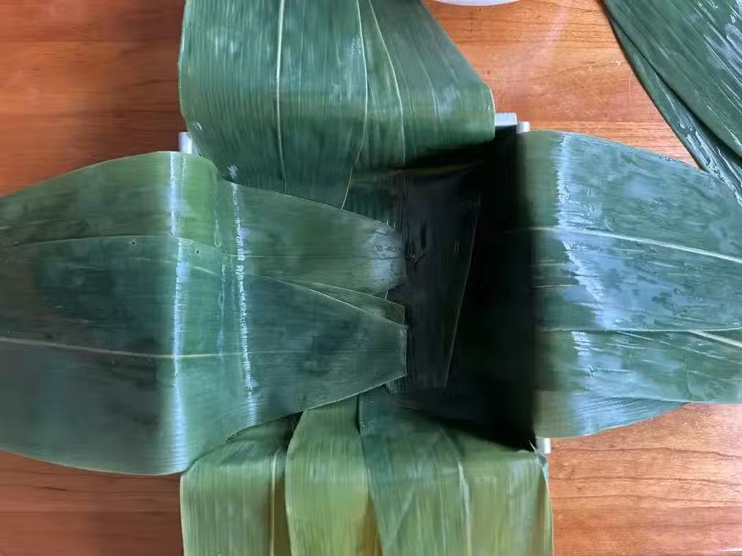 3、先把粽葉底部鋪一層蜜紅豆,再鋪一層糯米,上面鋪上去核紅棗;再鋪一層糯米撒上薄薄一層綠豆和葡萄乾,最後把剩餘的糯米鋪上去,多餘的粽葉封口;
