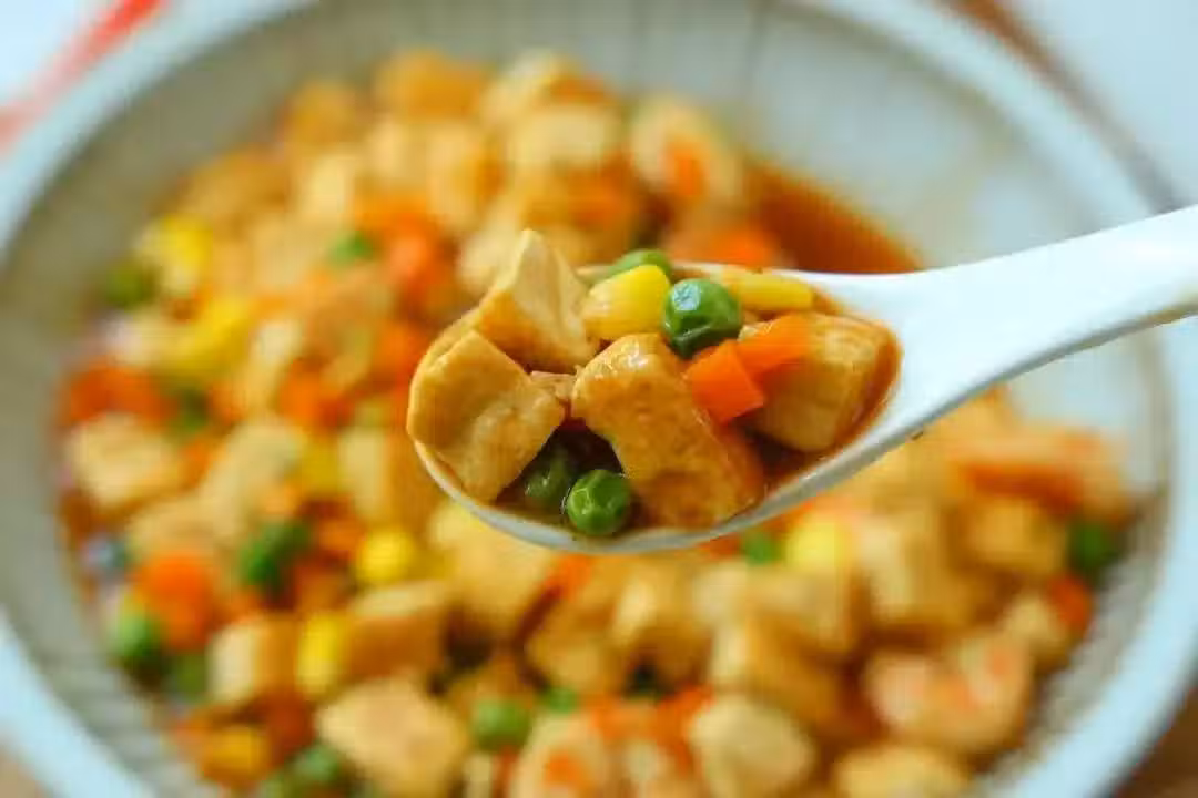 製作配料:嫩豆腐1塊 蝦仁適量 豌豆、玉米粒、胡蘿蔔丁適量