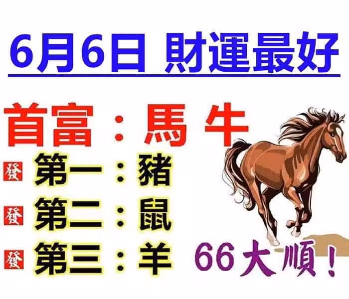 生肖馬天生就樂觀積極,為人處事也是大方真誠,有很好的人脈關係。 進入6月以後屬馬人受到午火的幫助,開始漸趨運旺,特別是過了6月6日以後屬馬人在事業上會更加的順溜,六六大順是一個吉祥的開端,本月屬馬人能力增長迅速,另外加上年運財星的入命,本月開始屬馬人會財路大開,一路發財數都數不完。