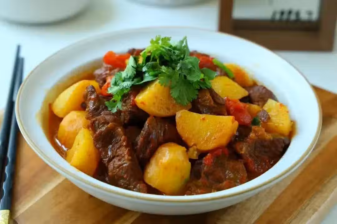 6、牛肉差不多熟了,加入土豆塊和剩餘的西紅柿,繼續小火燉10分鐘左右,土豆熟爛就可以關火了,出鍋撒香菜!