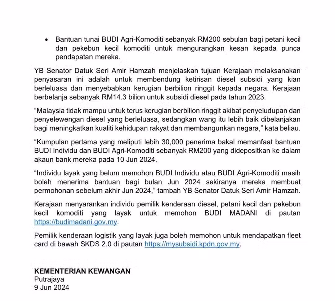 年收入不超過RM100,000的中低收入柴油私家車車主可每月獲得RM200柴油補貼,這筆柴油補貼每月將匯入車主的銀行戶口。小農戶、小園主、養殖戶等也可每月通過銀行戶口獲得RM200柴油補貼。