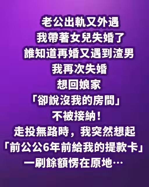 老公出軌又外遇,我帶著女兒失婚了…誰知道再婚又遇到渣男我再次失婚,想回娘家「卻說沒我的房間」不被接納! 走投無路時,我突然想起「前公公6年前給我的提款卡」查看餘額愣在原地~