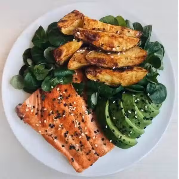 午餐:烤地瓜+烤鮭魚+酪梨+青菜