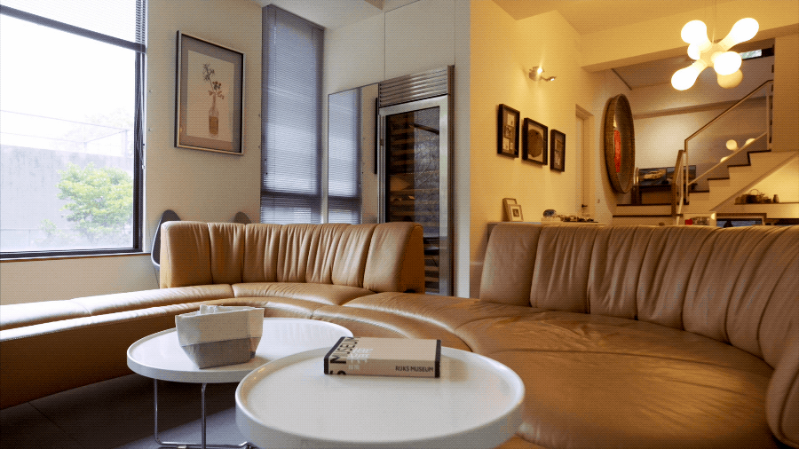 Kevin家在住宅區的第二排,從前院進門後,一樓是客廳。房子沿著坡度蓋,所以往上是臥房和私人空間,往下則是餐廳和後院。