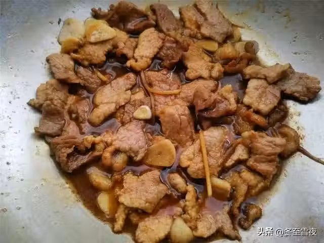 6.淋入料酒和醬油,把肉片翻炒上色,料酒可以去除豬肉的腥味。