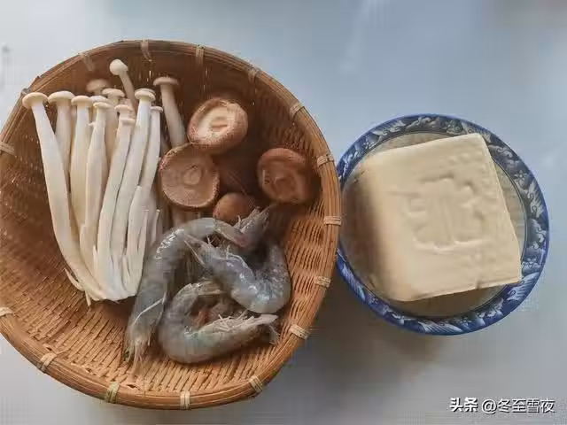 【蝦仁菌菇豆腐湯】所需材料:青蝦7-8個、海鮮菇120克、香菇5-6個、豆腐1塊、油鹽適量、蔥1段、姜2片、料酒半湯匙、白鬍椒粉1茶匙、雞精1茶匙、
