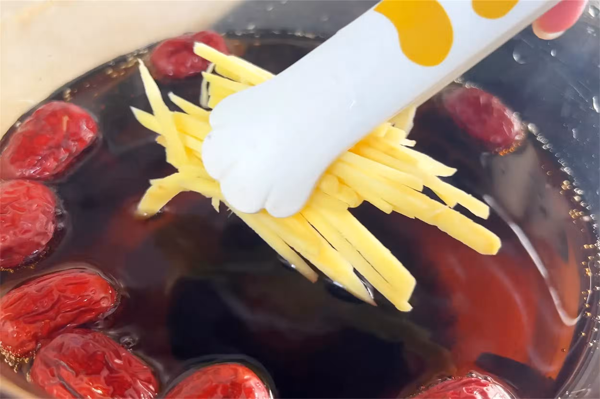4、大火煮開,轉小火燉煮五分鐘,把蘋果倒入鍋中,再繼續煮五分鐘。