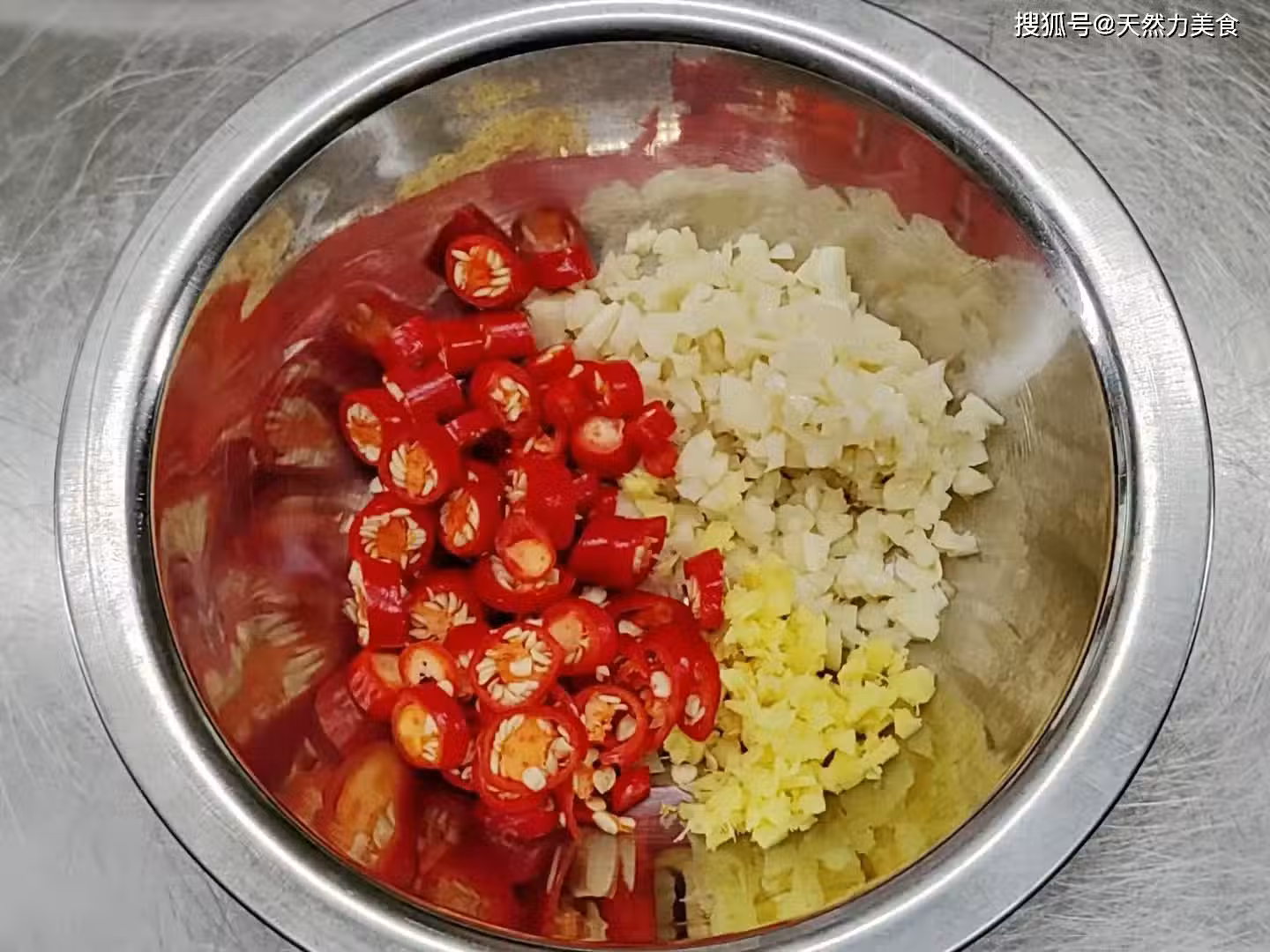 3、熱鍋後加入30克油,開大火把油燒熱,油溫6成熱時打出澆在蒜末和小米椒的上面,讓熱油把配料的香味激發出來。然後加入3克食用鹽,2克雞精,2克白糖,20克生抽,攪拌均勻,這樣一個香噴噴的料汁就調製好了。