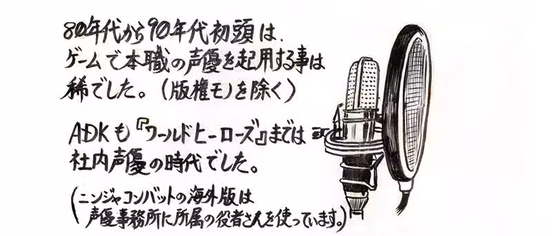 「某一天,從大阪出差回來的新井社長一開口就說:『聽說SNK下次出的格鬥遊戲要找專業聲優,我們也不能落於人後!』看來社長真的很羨慕人家可以請專業聲優,於是在《WORLD HEROES2》之後,我們也都請專業或兼職聲優來配音了。」