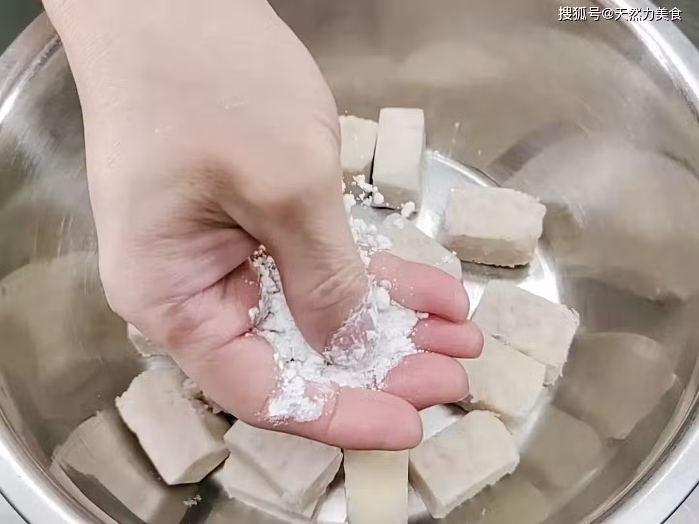 11、撈拌均勻後我們再次撒入5克玉米澱粉,然後再次下手撈拌均勻,這樣可以讓香芋更均勻地裹上澱粉。因為香芋的表面比較光滑,所以讓香芋裹上一層澱粉,這樣可以更好地掛上鹹蛋黃。