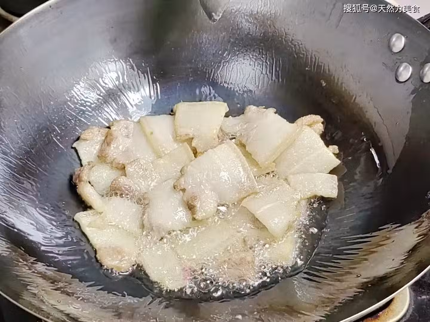 16、我用到的這個五花肉比較肥,所以煸炒出來的油脂也就比較多,我們可以打出一些來,鍋內只留適量的油就可以。