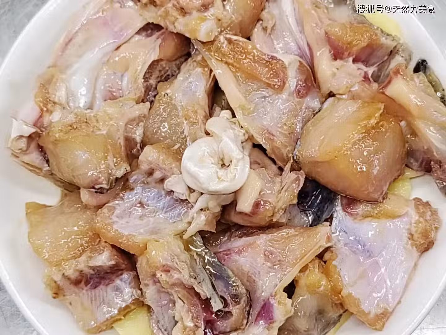 10、把炒好的剁椒醬均勻地澆在魚頭的上面,這樣才能讓每一塊魚頭都吸收到剁椒醬的味道,讓每一塊魚頭都能均勻地入味。