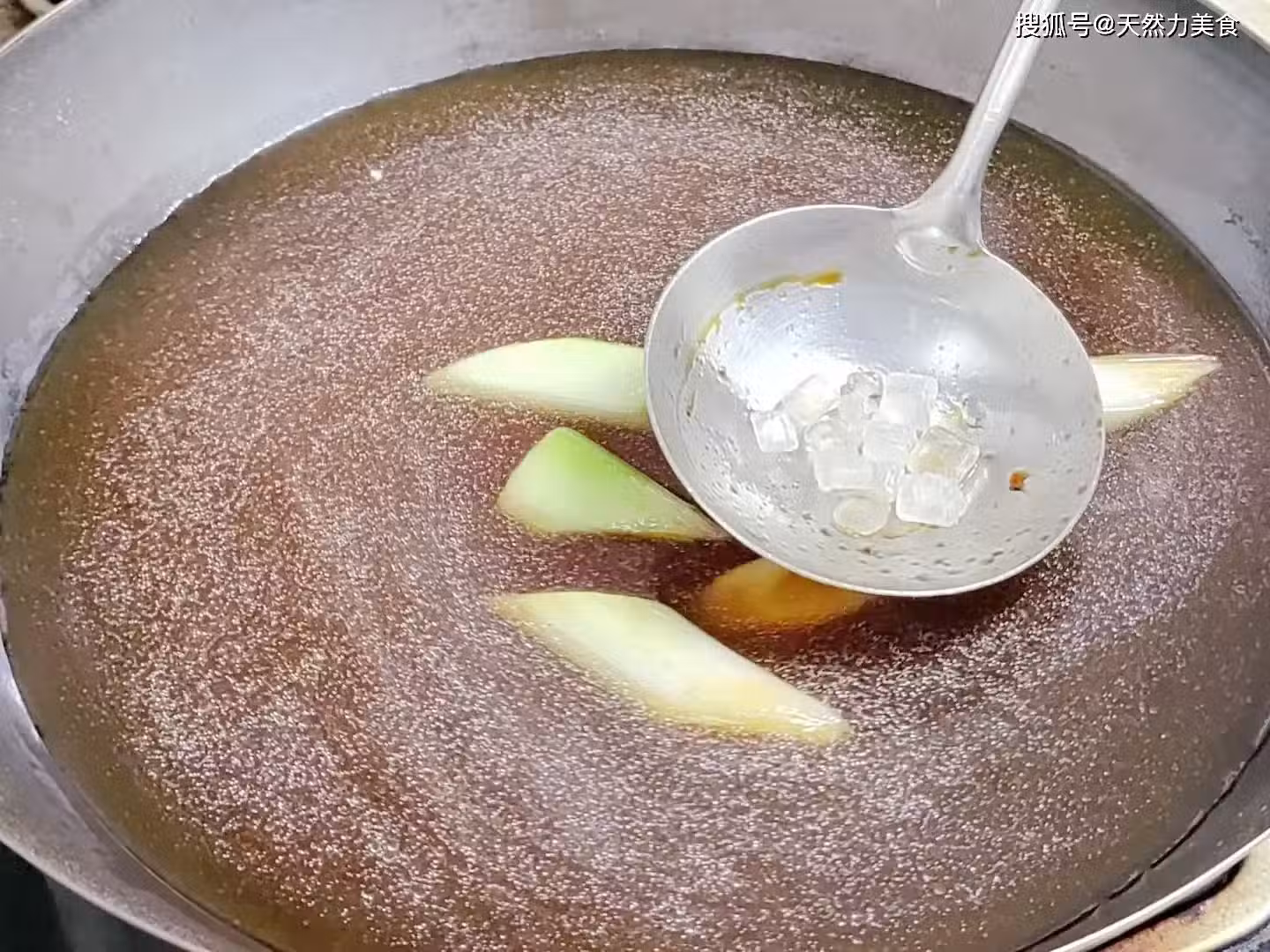 7、來看看這個湯汁的色澤,這個顏色稍微淡了點,可以加點老抽補一下顏色,讓顏色深一點,這樣做出來的把子肉更好看。