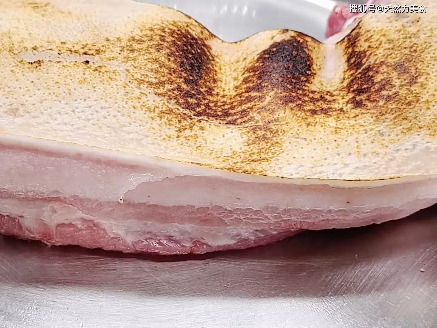 3、豬皮燙過後再用刀把燙焦的豬皮刮乾淨,刮乾淨後再清洗乾淨後控水。經過這樣的處理這個豬皮就不會有任何異味,而且吃起來不僅更香,口感也更好。