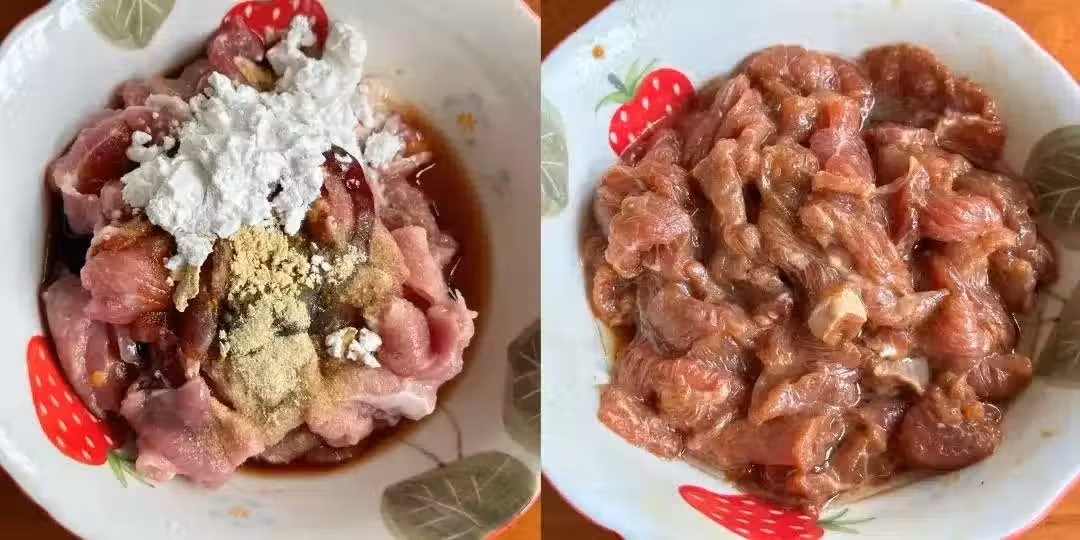 2、在等待肉片腌制的同時,我們可以開始準備蔬菜。將平菇清洗乾淨,輕輕焯水一下,去除其中的澀味。黃瓜洗凈後切成薄片,清脆爽口;胡蘿蔔去皮切片,不僅為菜品增添了色彩,也增加了蔬菜的種類和營養。