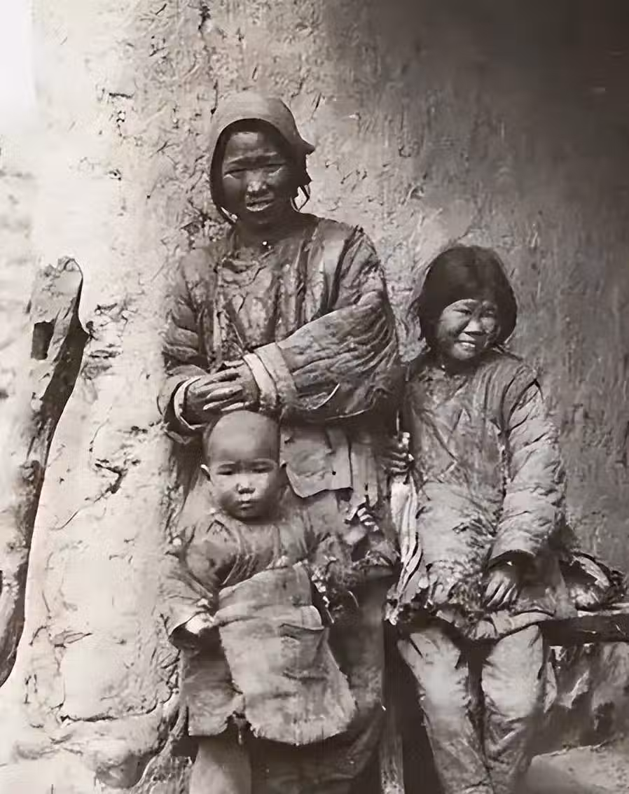 山東半島某地農村,生活在農村的一家人穿著非常破爛,但沒想到,已經窮到這個地步了,家裡還能不忘記給小孩裹腳,裹腳的觀念在這些老太太心裡已經太深入了。