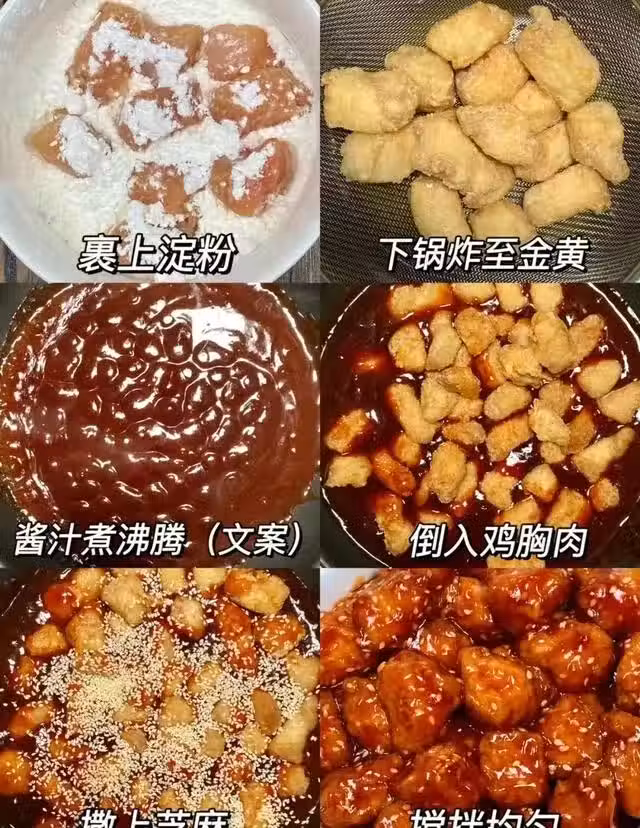 4、雞胸肉炸好之後撈出,鍋中留少許的底油,倒入醬汁,將醬汁煮至沸騰之後,倒入雞胸肉翻炒均勻,再撒上一點白芝麻攪拌均勻即可盛出,這道糖醋雞胸肉就製作完成了。