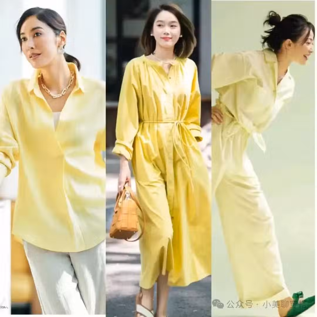 鵝黃色的襯衫,搭配淺灰色的闊腿褲,配色低調輕盈,帶著青春的活力感,又顯得高級。也可以選擇一條鵝黃色的連衣裙,清涼飄逸,減齡效果非常好。