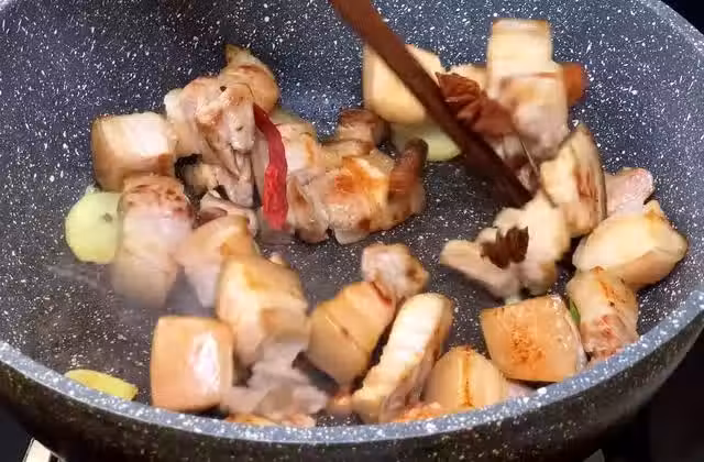 3、開火,鍋中倒入少許的油,倒入切好的五花肉塊將它煸炒出油,這樣做出來的紅燒肉不會那麼油膩。煸出油後放入生薑、蔥段、八角、干辣椒、陳皮翻炒一下。