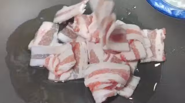 5、起鍋燒熱倒入少許食用油放入五花肉在鍋中進行翻炒,炒出五花肉裡面的油脂。