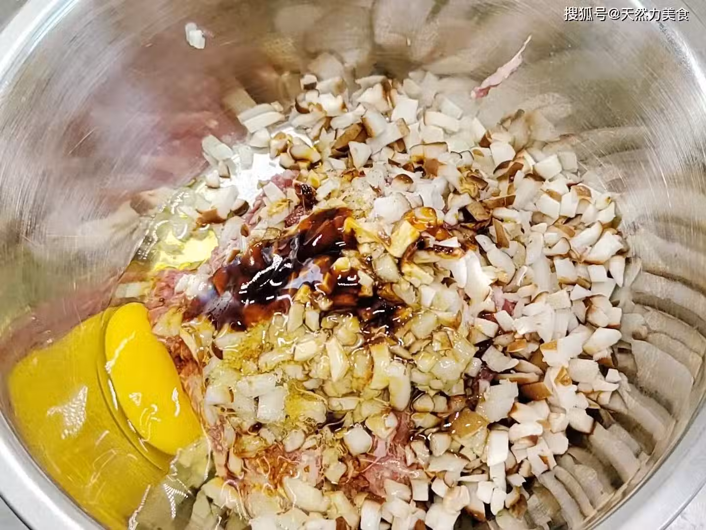 6、接著加入15克澱粉,繼續充分攪拌均勻,加澱粉可以讓肉末跟功能團在一起不散,但是澱粉不能加太多,否則會影響成菜後的口感。