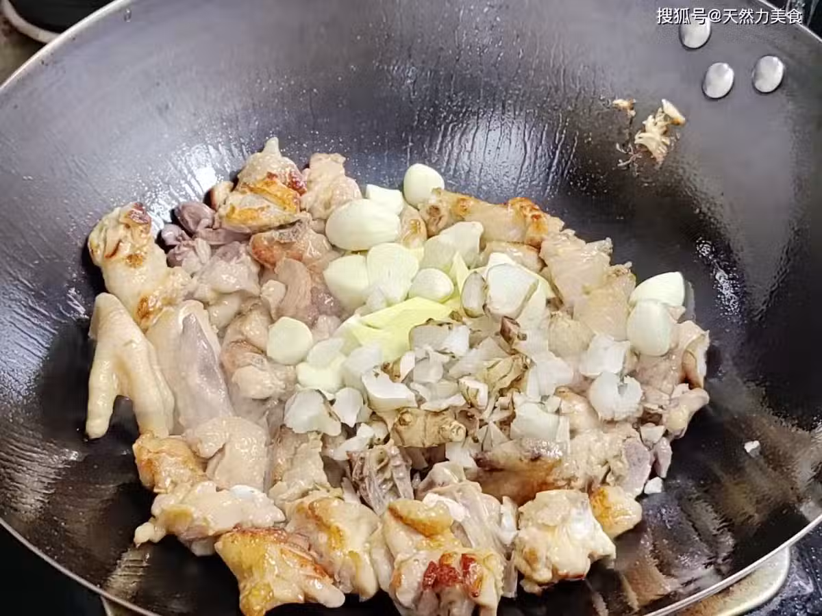 5、淋入50克廣東米酒,翻炒均勻,加米酒可以去腥增香,沒有米酒的可以用黃酒或者料酒都可以。酒精的揮發會帶走雞肉中的腥味,留下來的就是香味了。
