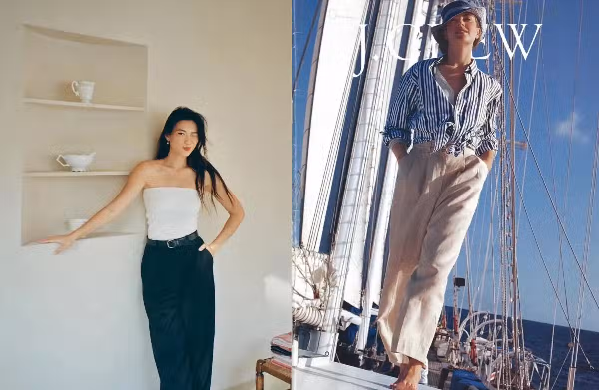 米白色闊腿褲搭配條紋襯衫,今年夏日的高級感屬於鬆弛風當道,選擇簡潔利落的款式,能夠提升整體的舒適感,一件藍色針織衫作為披肩可以點綴出時髦個性的氛圍
