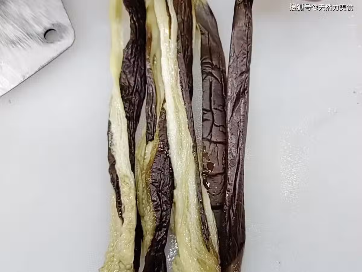 9、把茄子全部撕好後再切成6-8厘米的段,切長一點或者短切短一點都無所謂,這道菜是做給家人吃的,追求的是好吃入味,而不是好看。