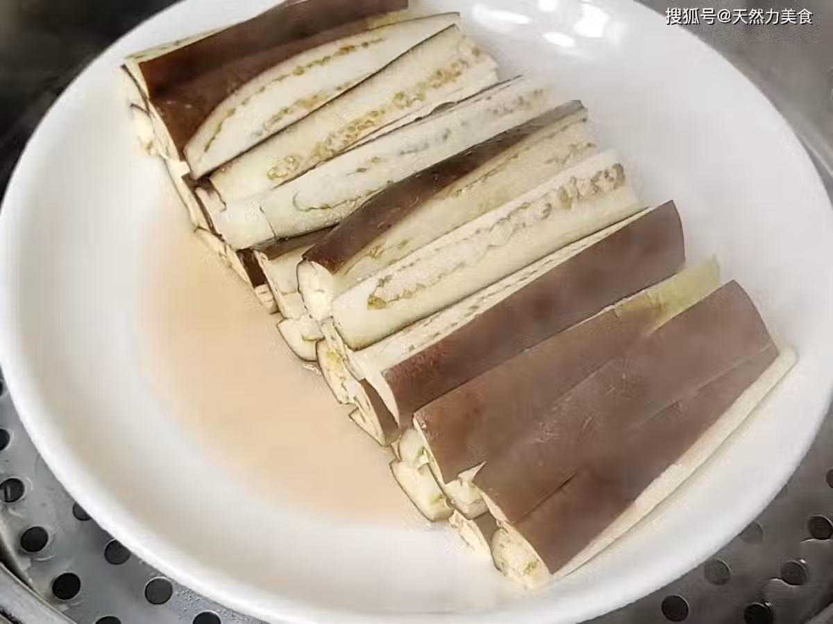4、時間到,茄子蒸好了,可以出鍋啦,如果看到盤中有蒸汽水的話就要把水瀝掉,這樣才不會沖淡調料的味道。