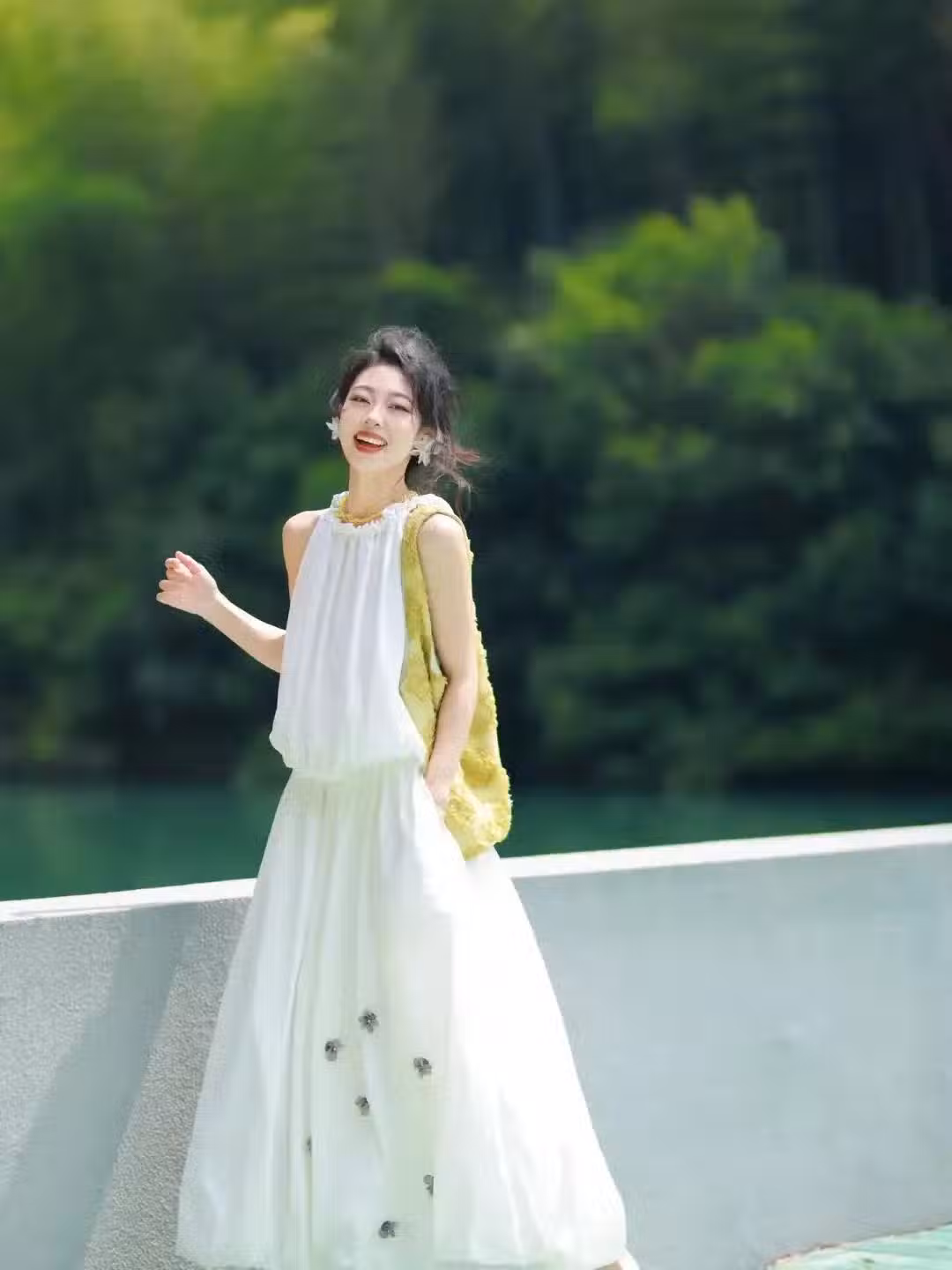 裙子拍照,動作少確實溫柔好看,但是有些時候,動作大一點也挺美,向下面的女士一樣,正面對著鏡頭笑,一隻腳為重心,一隻腳跨出去,一手抬起來假裝撩頭髮,一手平舉著,這樣就有種動態的氣質美,也能拍出又高又好看。