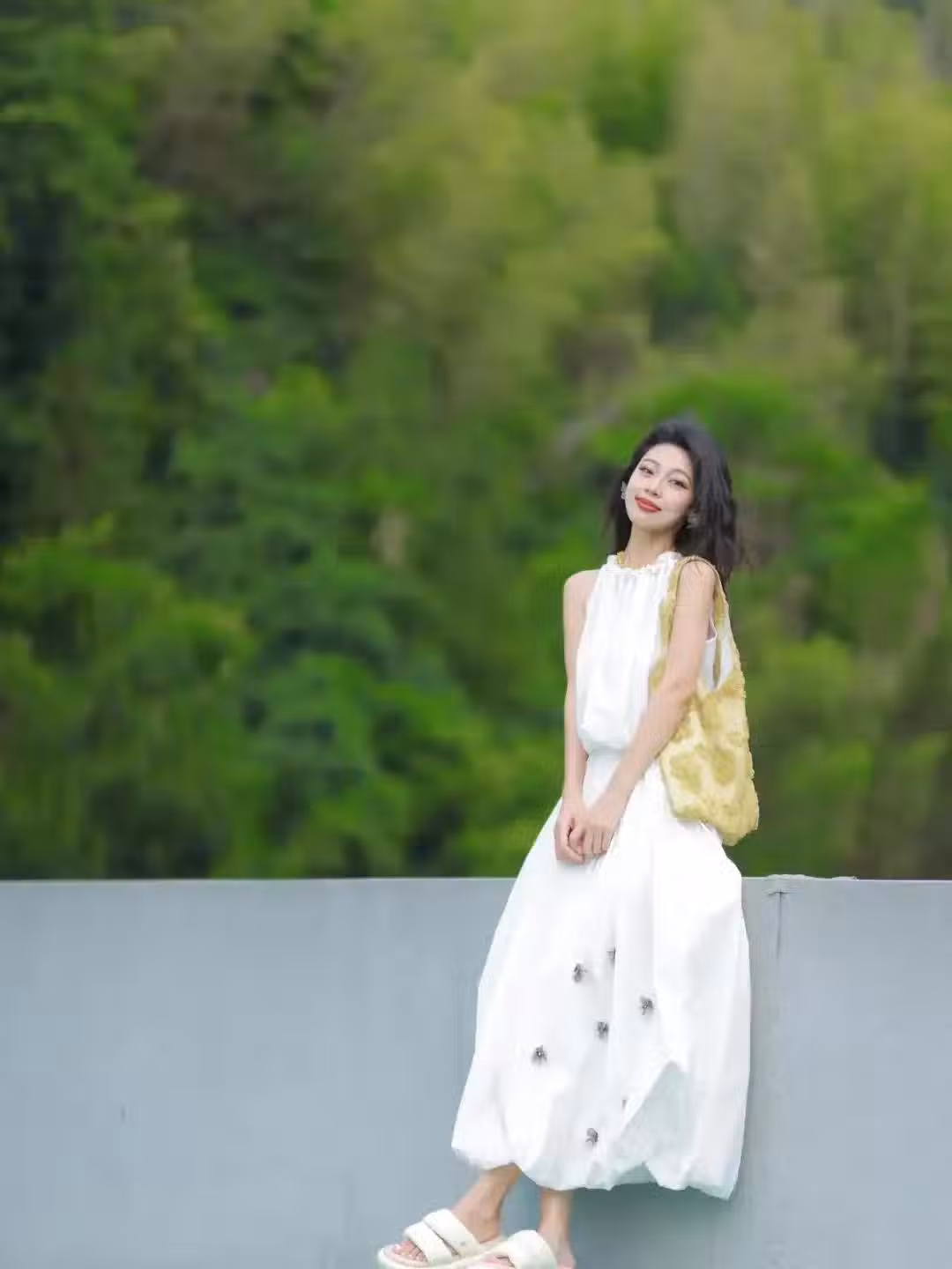 穿裙子拍照,不一定都要站著拍,偶爾當自己側坐下來,找一個舒服的姿勢,也能很氣質好看,比如下面這個側坐下來,手放自改,一手撐著膝蓋托著腮,然後看鏡頭微笑的姿勢,看起來就很舒服自然,也能拍出氣質好看的裙子照片。