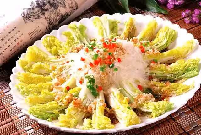 4、泡軟的粉絲鋪在盤底,擺放娃娃菜