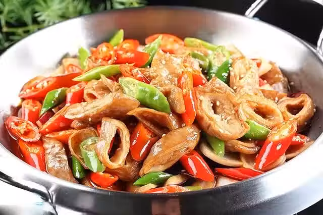 5.調至小火,放入適量孜然粉和干辣椒繼續翻炒 ,直至肥腸表皮有些許焦脆感,香味撲鼻。