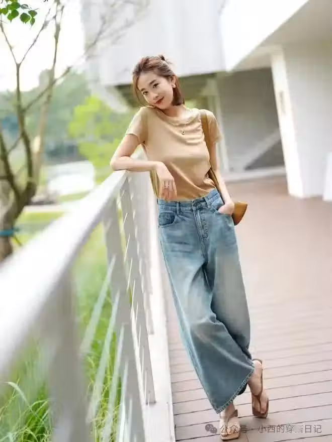 白色短袖襯衫與經典藍色牛仔褲的搭配,簡約而清新。黑色高跟鞋增添了一份成熟的氣質,而灰色的手提包則完美呼應整體色調,每一個細節都透露出對簡潔美學的追求。▼