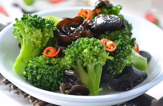 西蘭花、干黑木耳、玉米油、鹽、鮮醬油、花椒油、小紅椒